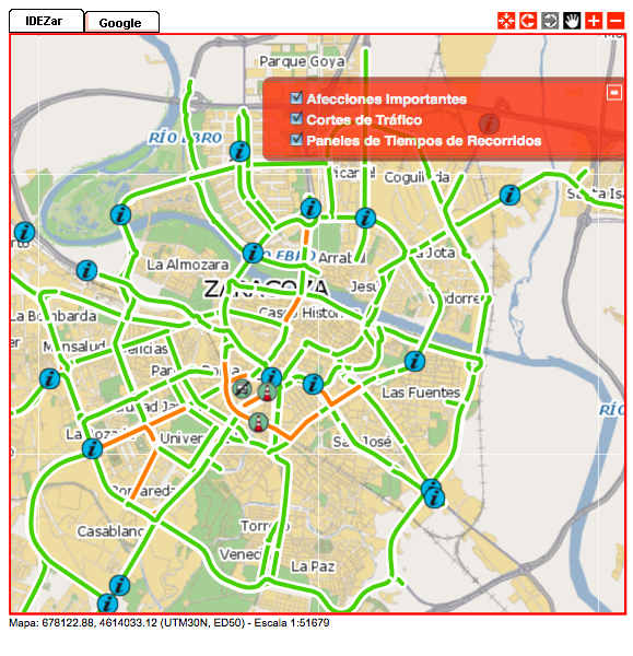 * Situación del tráfico, donde sobre un mapa de la ciudad se marcan toda las rutas, indicando para una de ellas un color que corresponde a su situación (fluido, denso, congestionado). Junto con esto, sobre el mapa se indican aquellas zonas afectadas por otro tipo de problemas (cortes de tráfico o afecciones importantes), para que los usuarios tengan claro la mejor ruta a seguir.