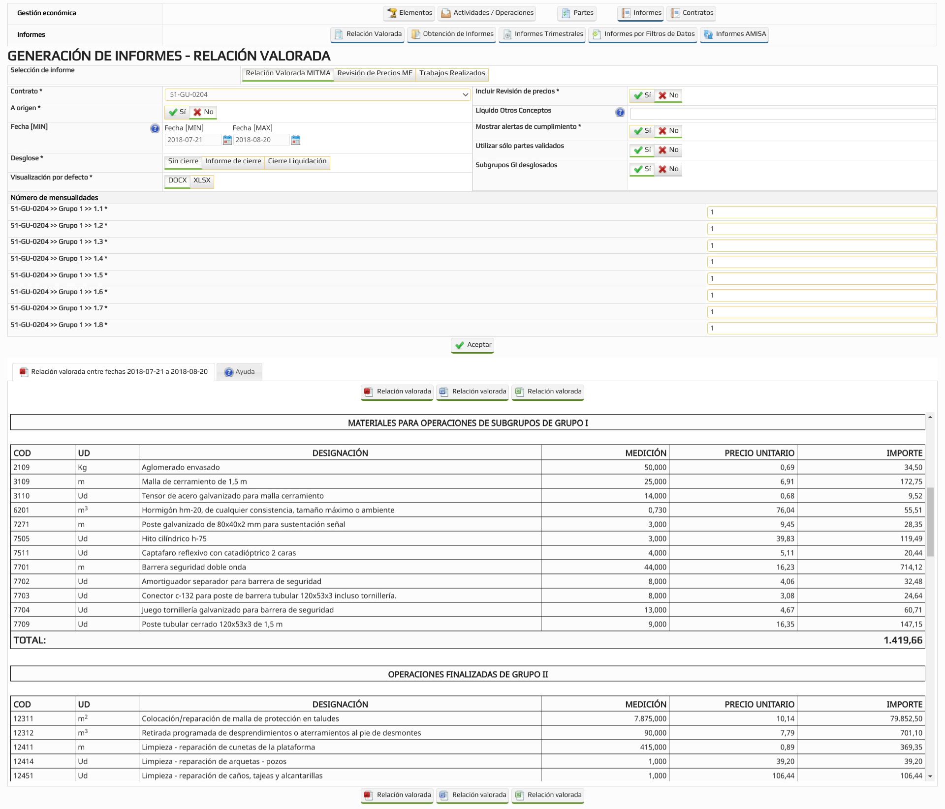 - Relaciones valoradas con formato NUDO, con diferentes coeficientes de adjudicación por contrato, diferentes anualidades por Grupo y Subgrupo, en DOCX, PDF, XLSX…